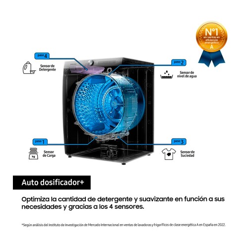 Gracias a sus 4 sensores, ajusta automáticamente la cantidad de detergente, suavizante y agua, así como la duración del ciclo de lavado, en base a la cantidad de ropa y nivel de suciedad.